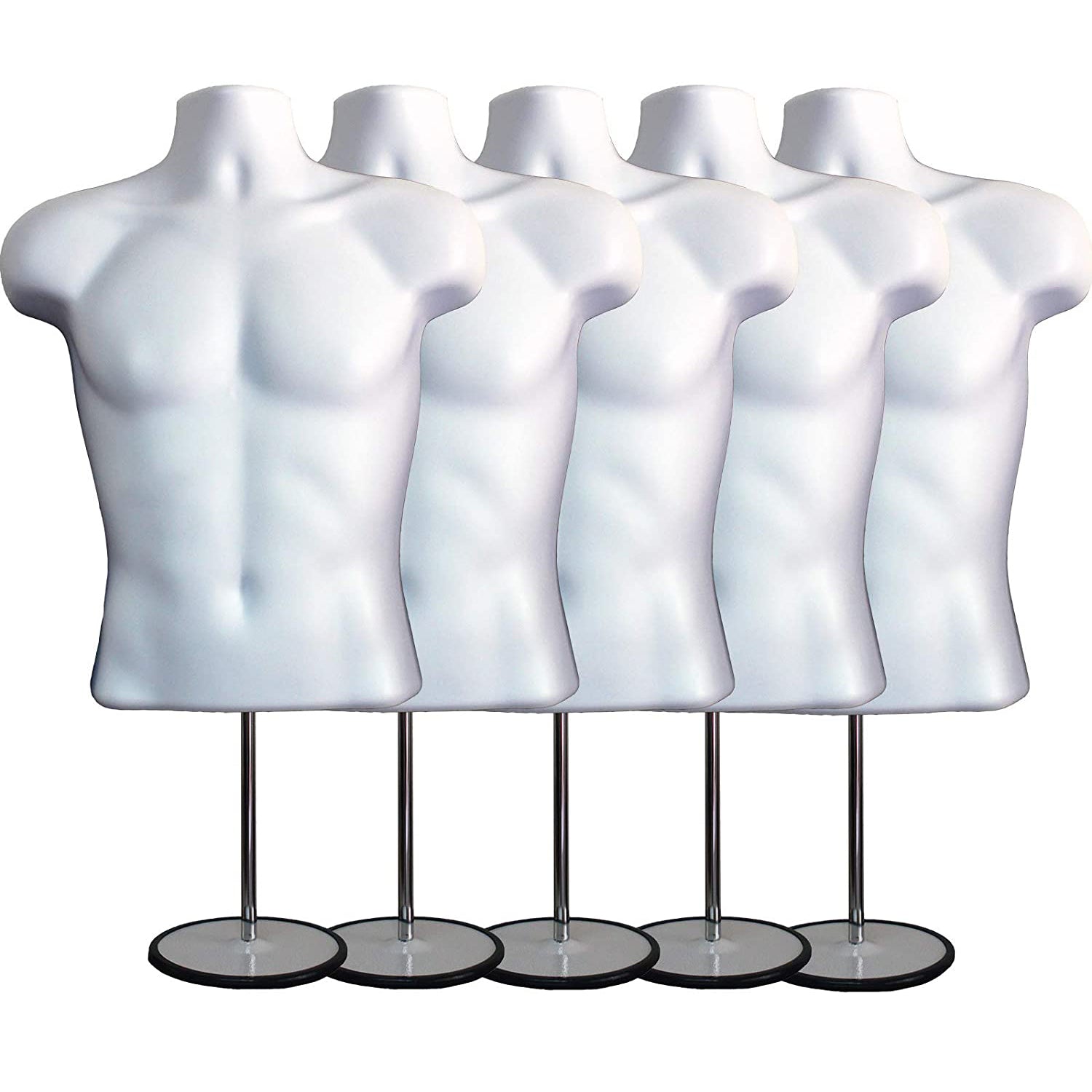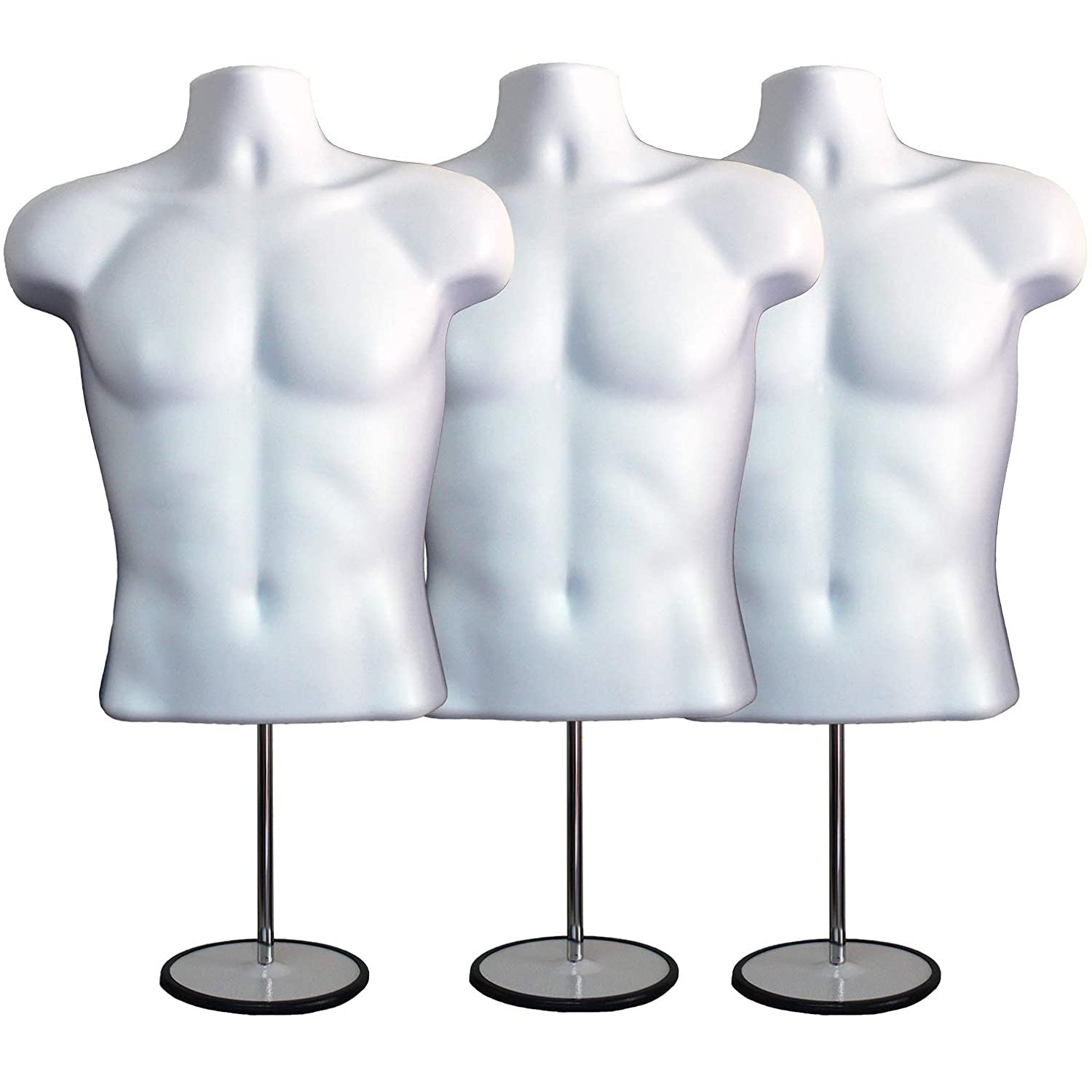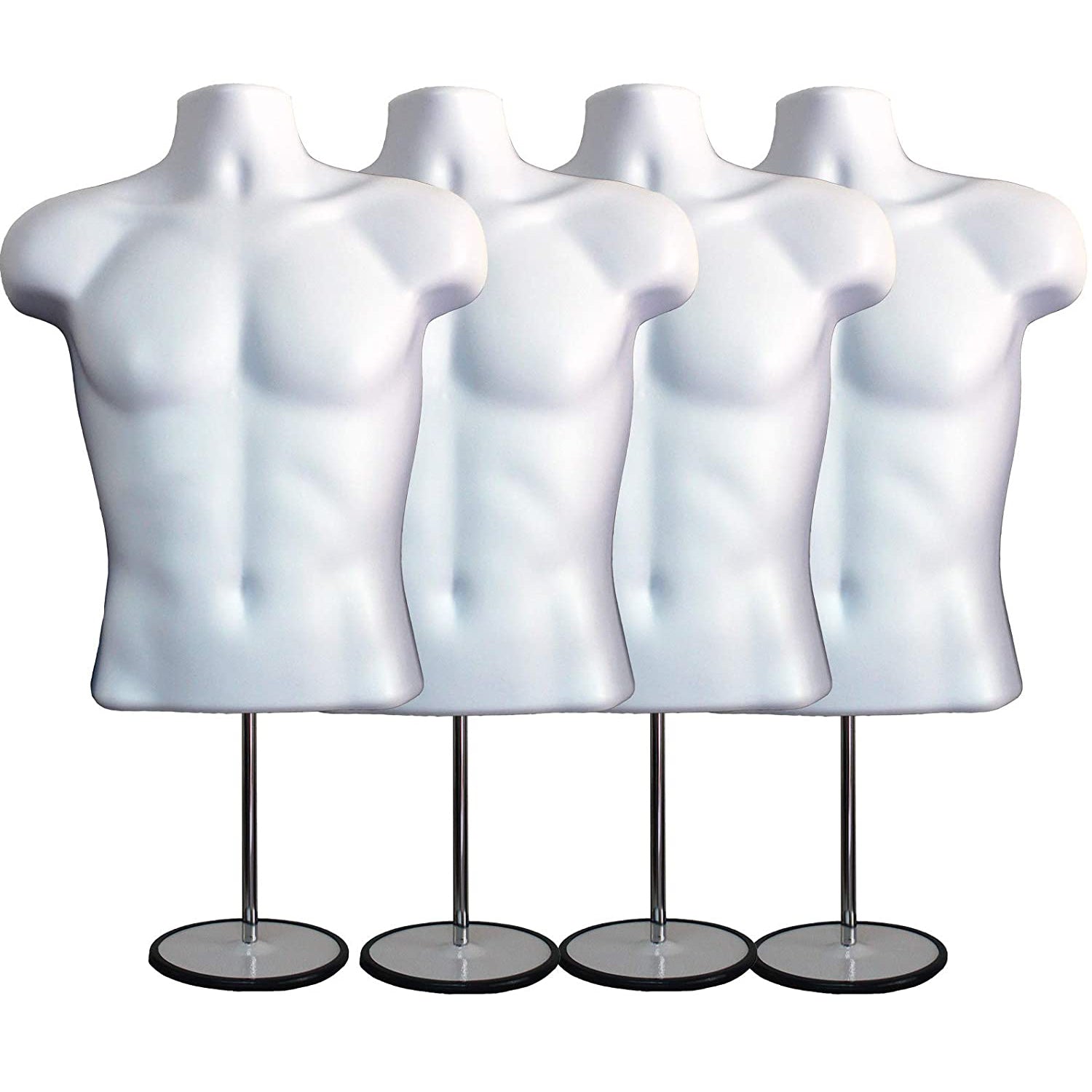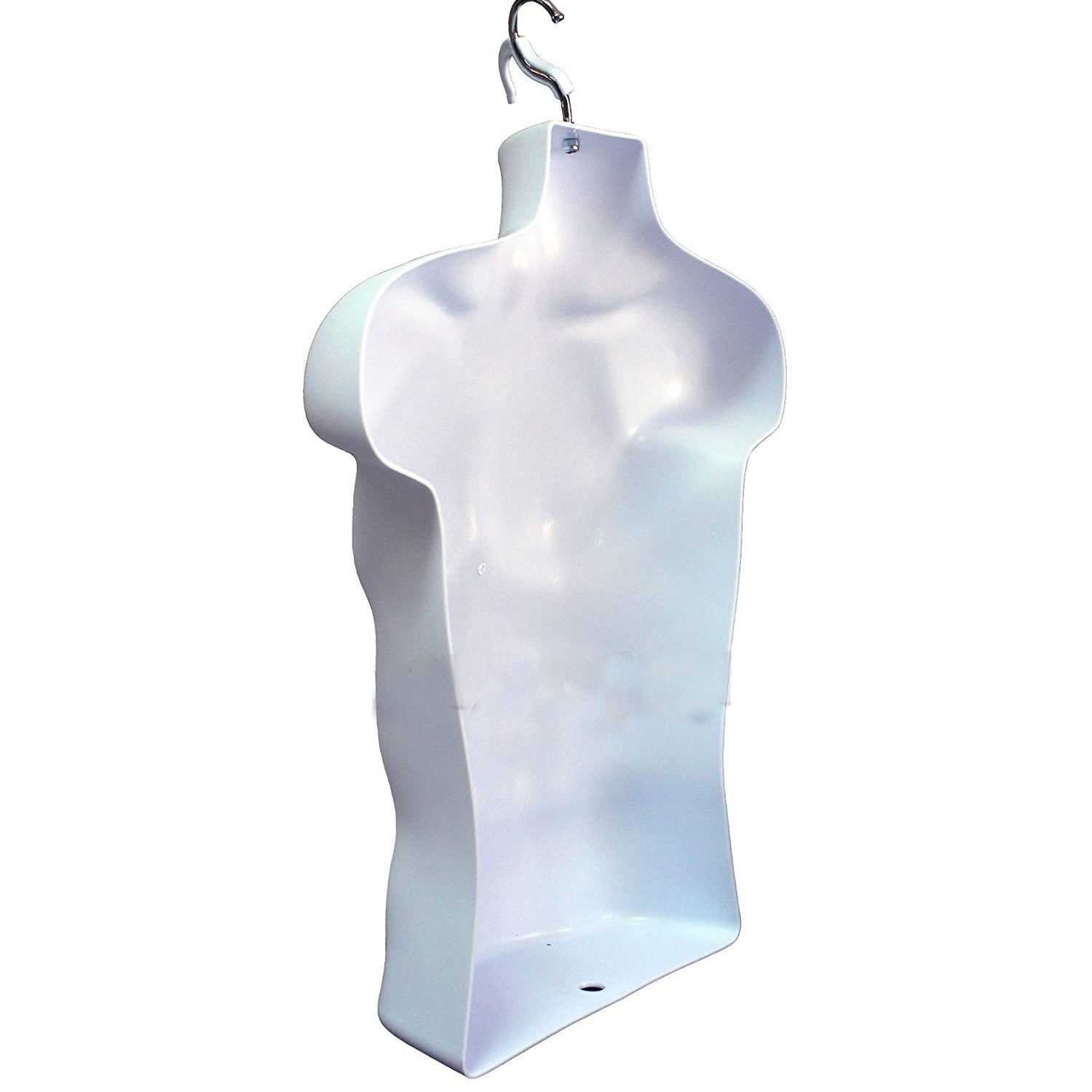 Male Mannequin Torso with Stand Dress Form Tshirt Display Countertop Hollow Back Body with Metal Pole & Hanging Hook S-M Clothing Sizes White